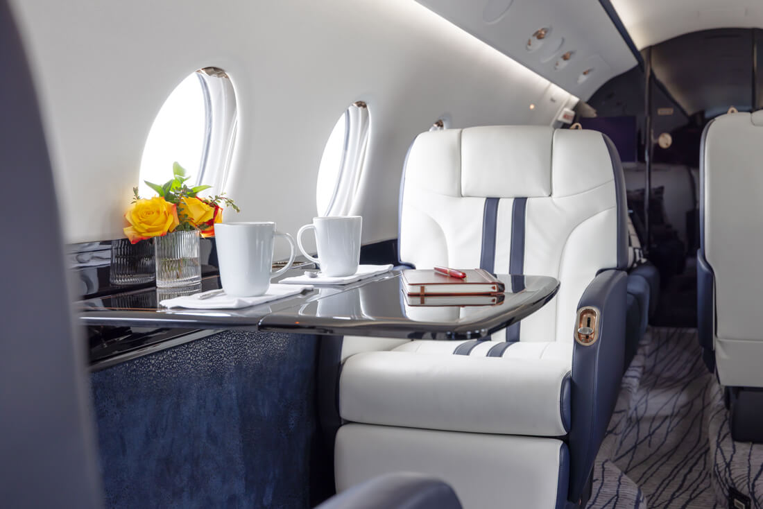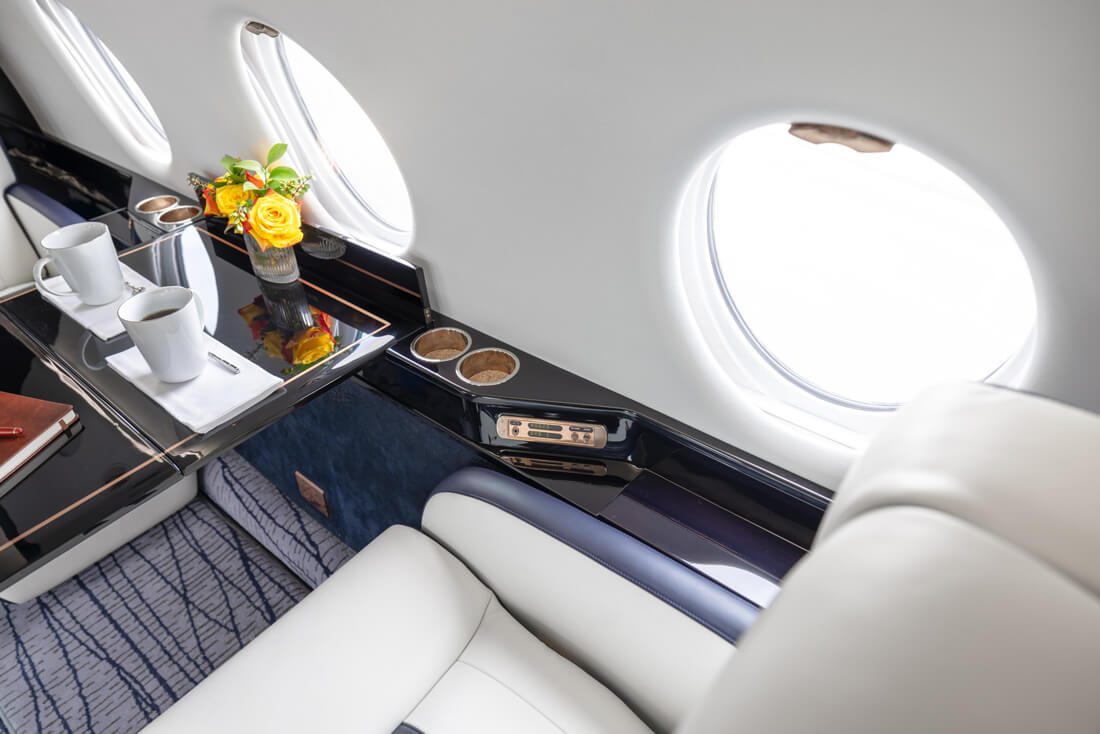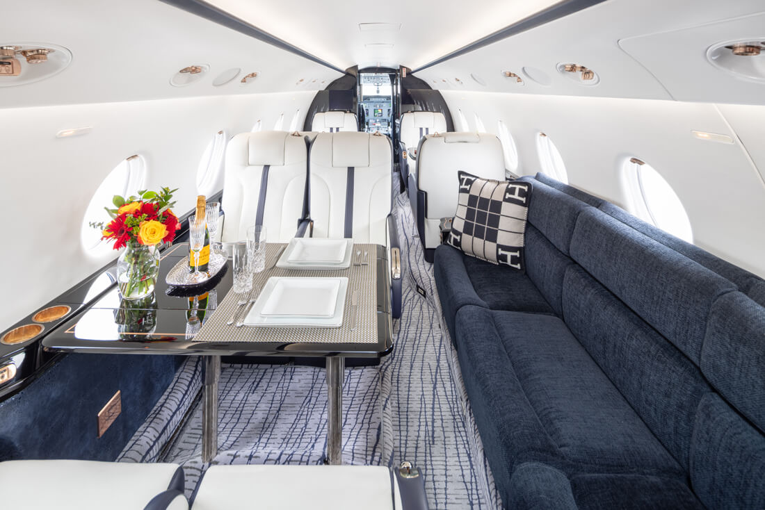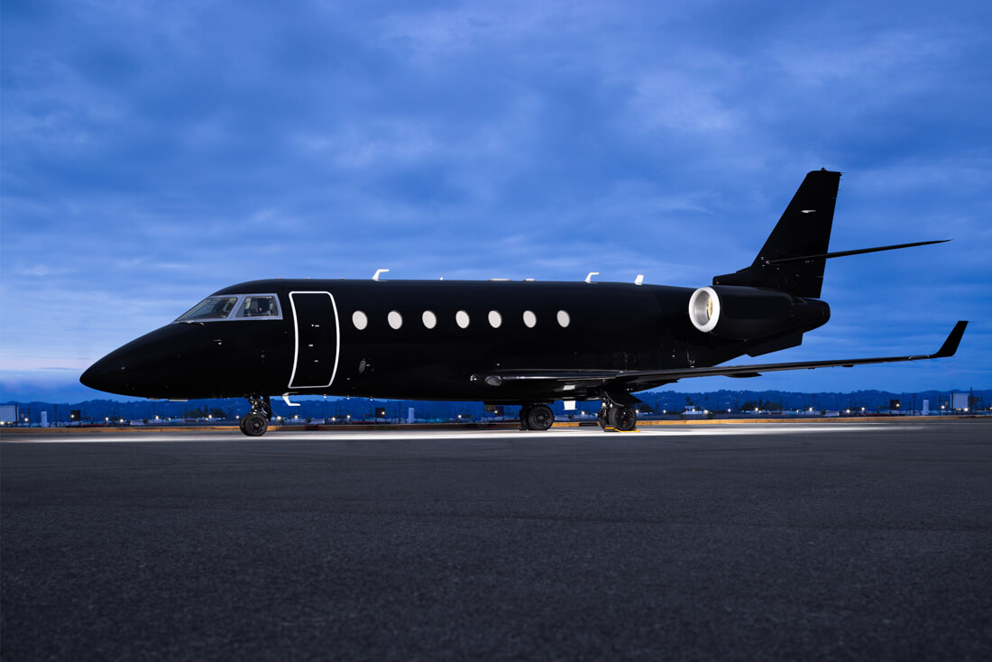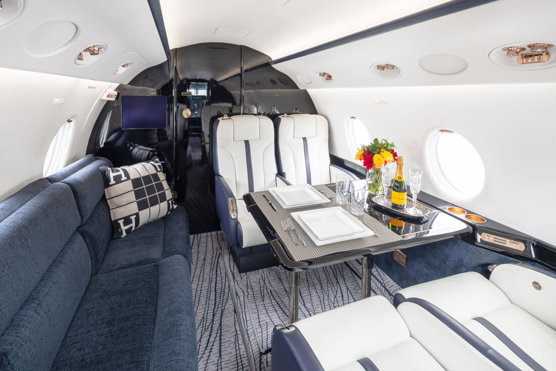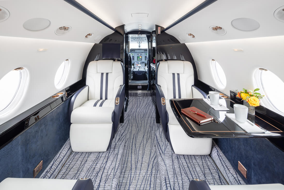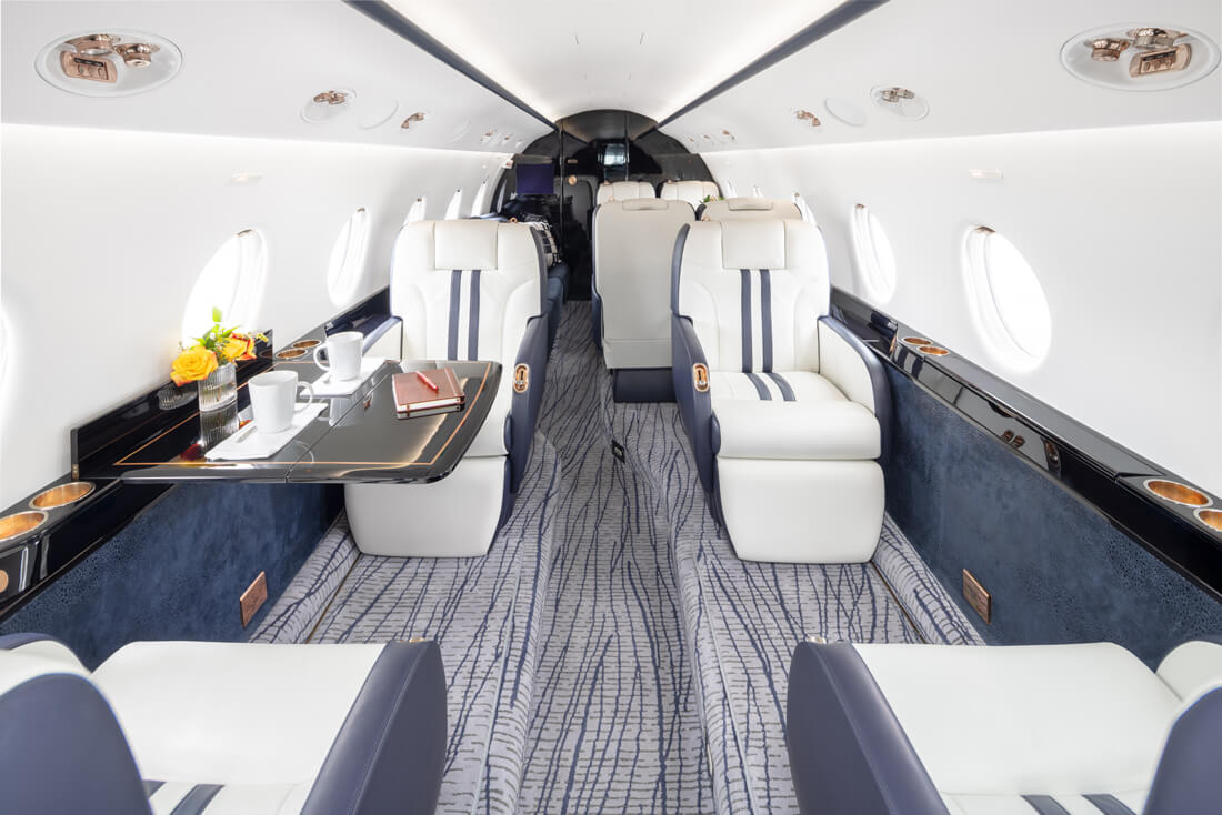 The super mid-sized Gulfstream G200 is world renowned for its exceptional performance and fuel economy, plus a spacious, largest-in-class 6’3” tall, 868 cubic-foot cabin. Cabin comforts, well-suited to non-stop, coast-to-coast travel, include oval windows that provide an abundance of natural light and a climate control system that continuously pumps 100% fresh, non-recirculated air every two to three minutes. Flexible seating comfortably accommodates up to 10 passengers, arranged in two cabin seating zones of four facing club seats each – plus a divan for two (that can also be used as a bed). Premium appointments include a full-service galley and refreshment center, private lavatory, and a generous 25 cubic-foot baggage compartment accessible in-flight. Plus, entertainment center, WIFI, bluetooth for music, and airshow screens.
