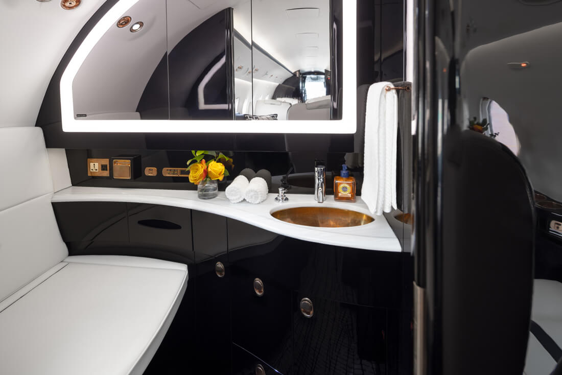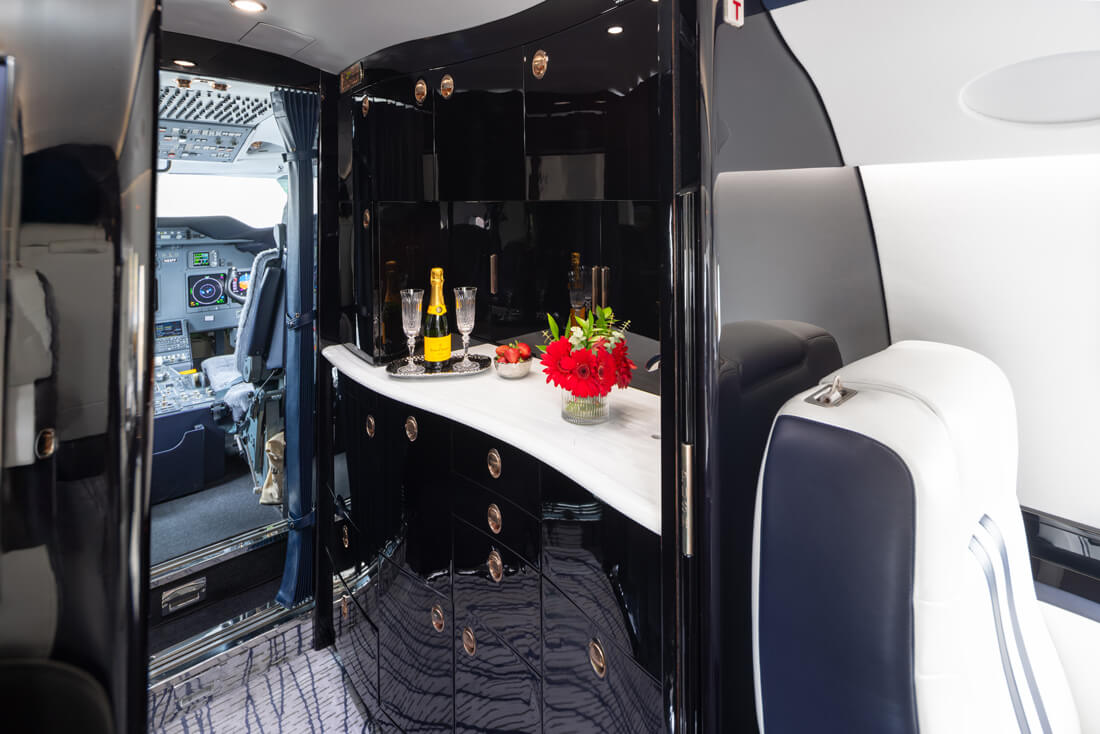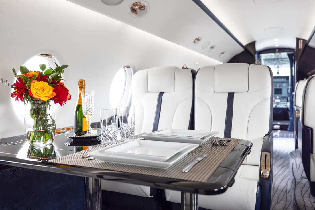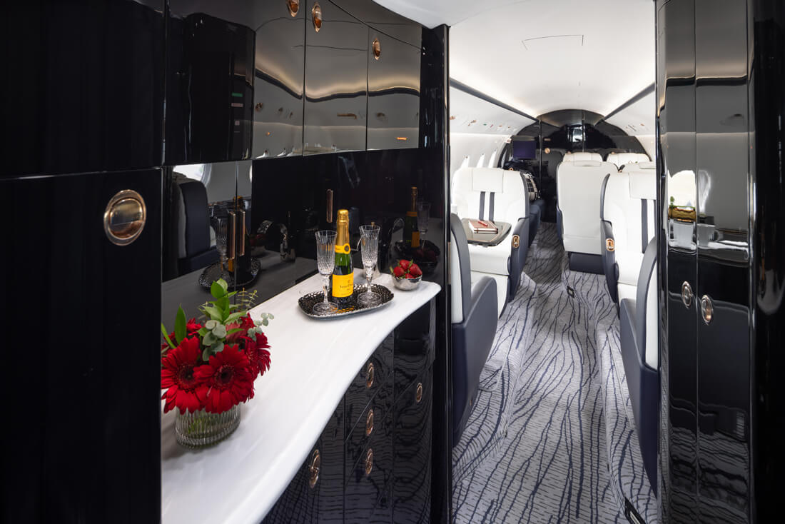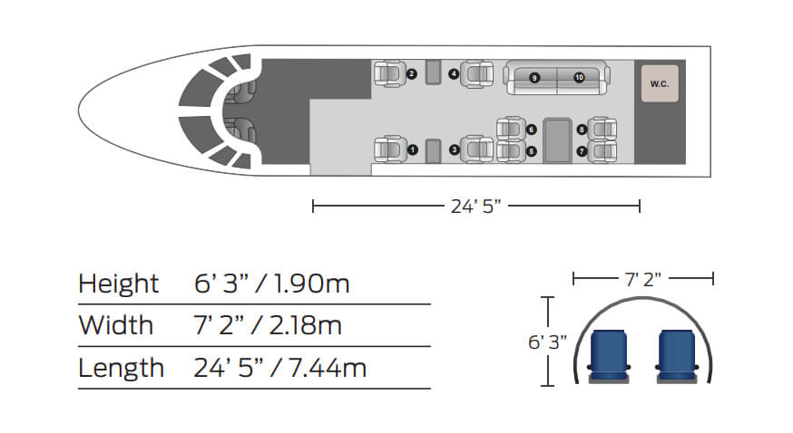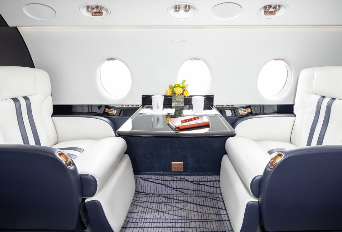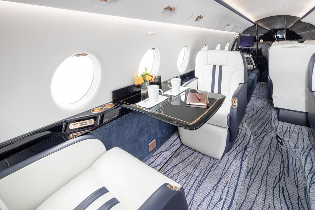 The super mid-sized Gulfstream G200 is world renowned for its exceptional performance and fuel economy, plus a spacious, largest-in-class 6’3” tall, 868 cubic-foot cabin. Cabin comforts, well-suited to non-stop, coast-to-coast travel, include oval windows that provide an abundance of natural light and a climate control system that continuously pumps 100% fresh, non-recirculated air every two to three minutes. Flexible seating comfortably accommodates up to 10 passengers, arranged in two cabin seating zones of four facing club seats each – plus a divan for two (that can also be used as a bed). Premium appointments include a full-service galley and refreshment center, private lavatory, and a generous 25 cubic-foot baggage compartment accessible in-flight. Plus, entertainment center, WIFI, bluetooth for music, and airshow screens.